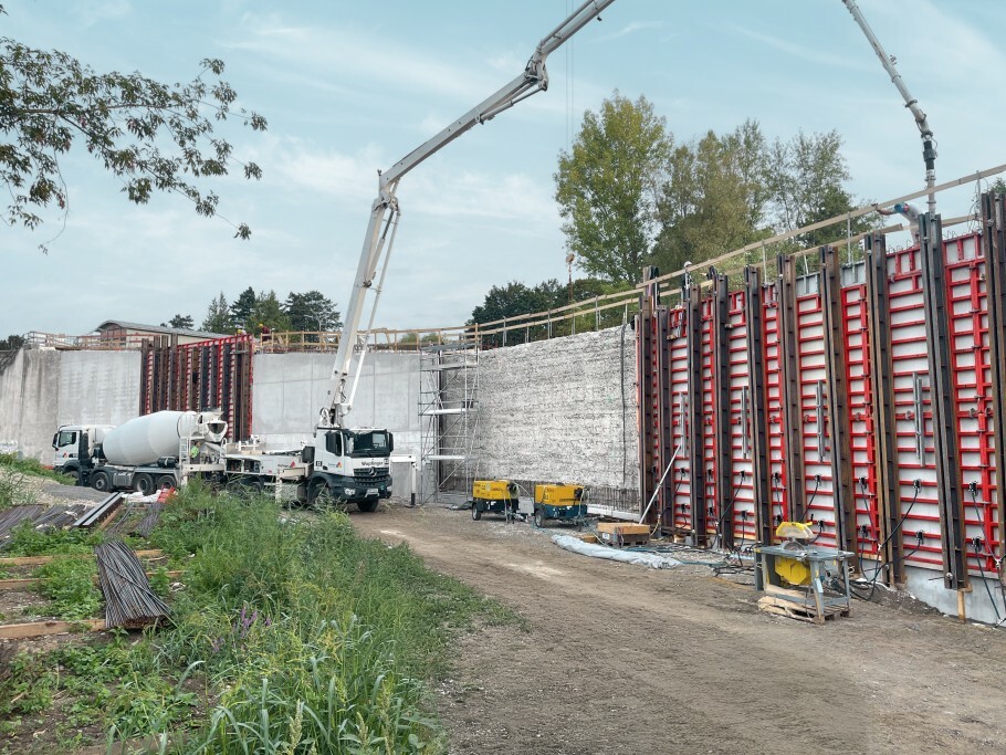 A kivitelezést végző GLS Bau und Montage GmbH a magas és vastag falak zsaluzásához a MEVA Mammut 350 falzsalurendszerét alkalmazta. A rendszer nagy teherbírásának köszönhetően teljes felületén képes felvenni a friss beton nyomását, ami különösen fontos a több méter magas falak esetében.