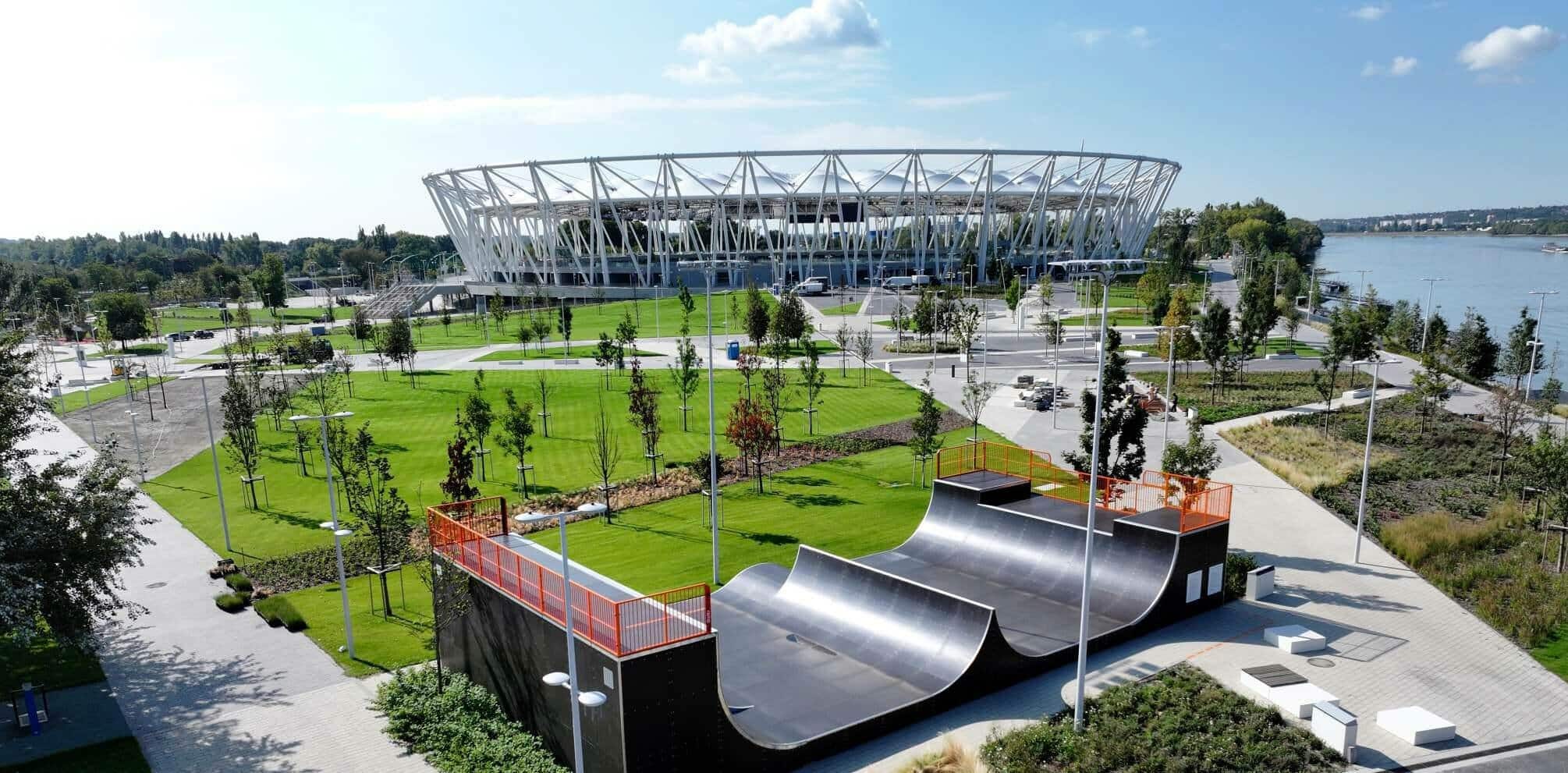 The Panorama Sports Park on the roof of the stadium's 15,000-seat grandstand has been enriched with a 650-metre rubber and concrete running track. The panoramic terrace offers a magnificent view of the city, and fitness islands have been built on the outer curve, with outdoor strengthening machines and equipment.